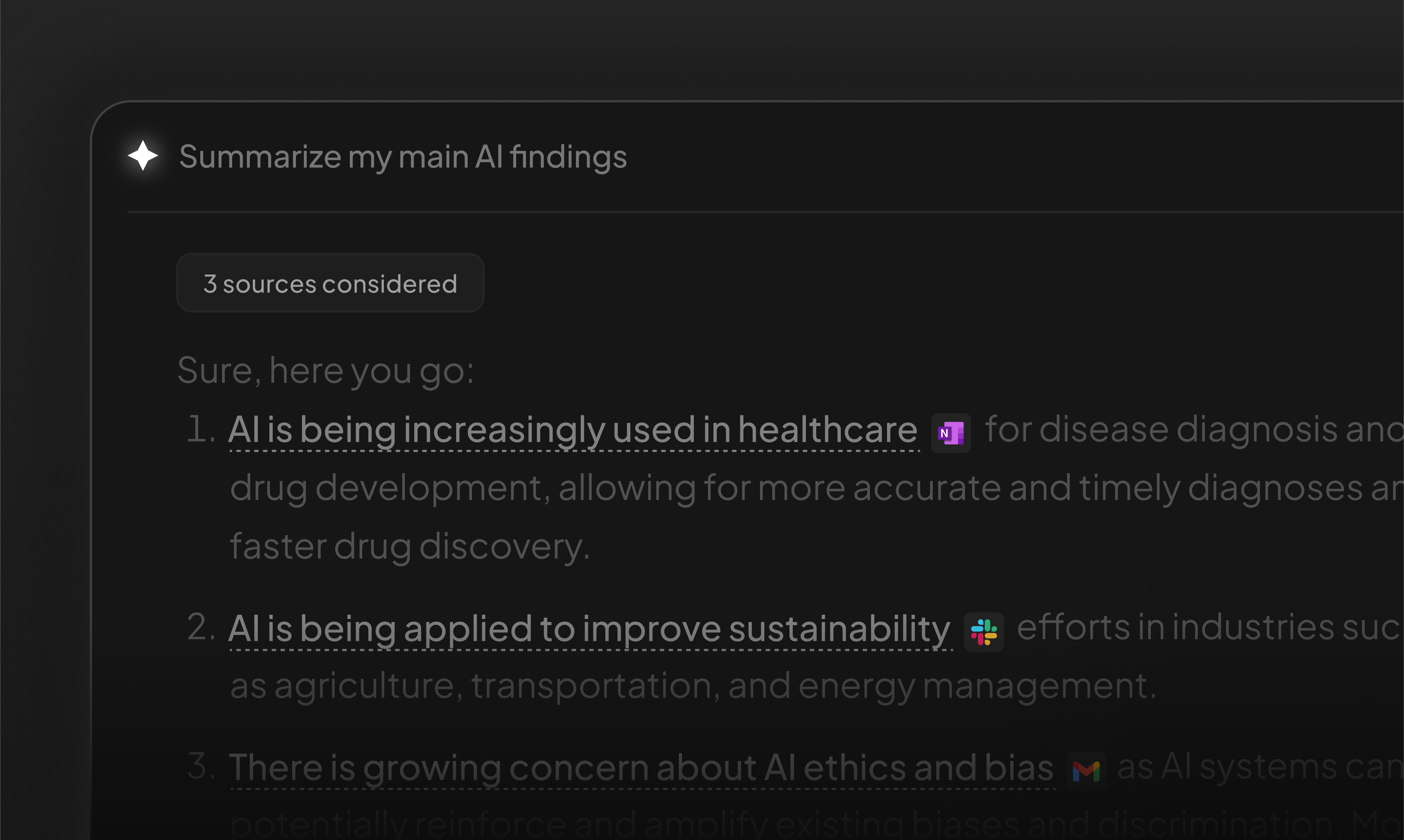 Enter Gems. Gems is your personal AI knowledge assistant. Just summon it via the CMD + G shortcut, type in your question in natural language and you’ll get a complete, synthesized and ready-to-use answer based on all of the information that’s in all of your apps.