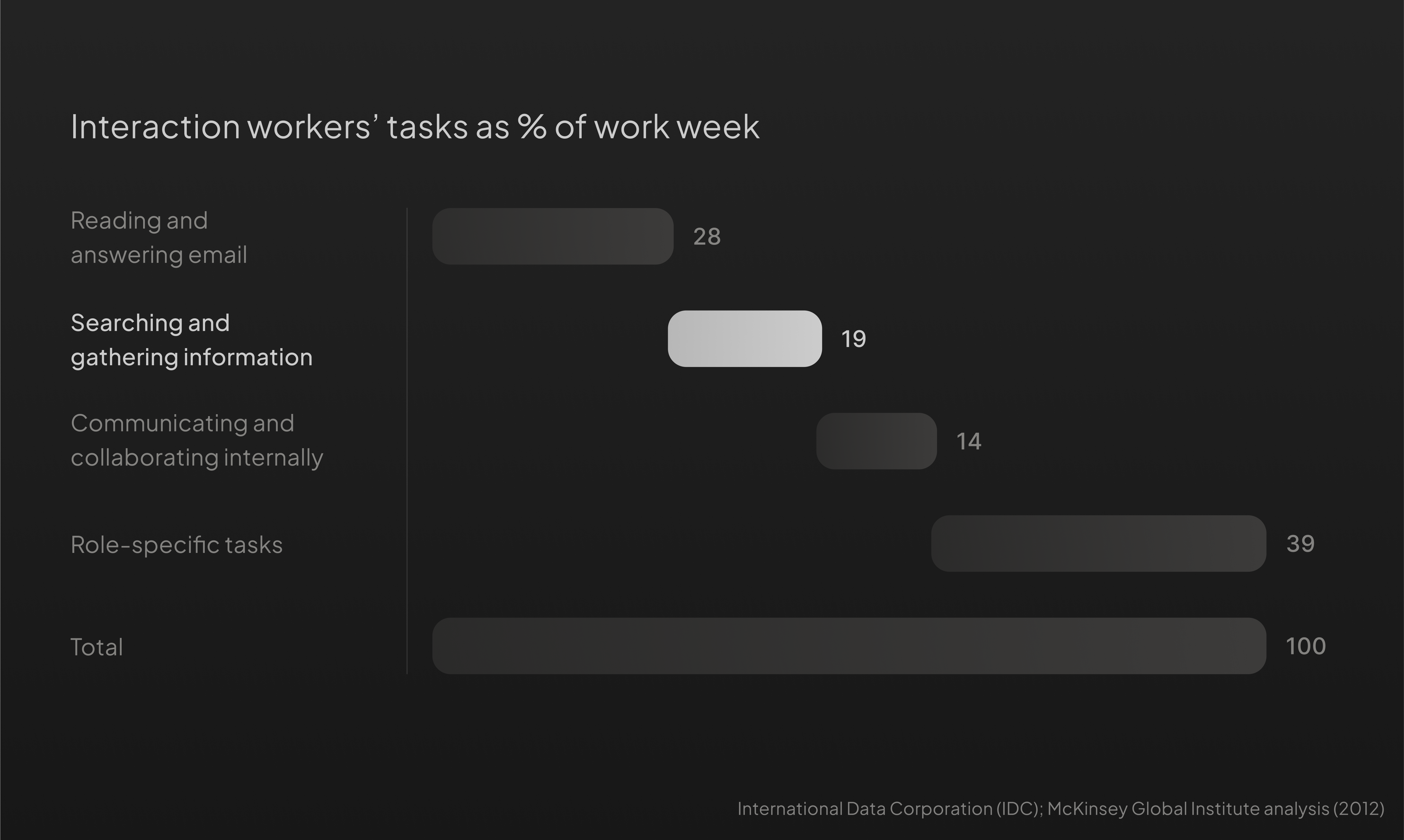 Knowledge is our biggest lever as knowledge workers. Unfortunately though, accessing knowledge in the digital realm is broken. We spend about 19% of our time searching for information (McKinsey, 2012). This is AN ENTIRE DAY of our workweek.